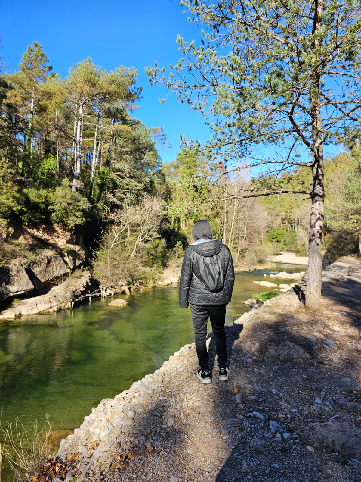 L’Ibrahima s’abraça al vell Pi de les Tres Branques, al pla de Campllong, després de conéixer la seva història, el seu simbolisme i al poeta que el va fer immortal.